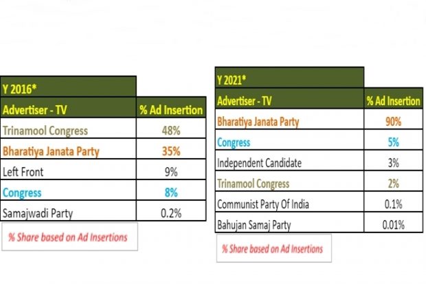 On TV medium, BJP was on top with 90% share of ad insertions in West Bengal assembly elections during 2021, whereas in 2016, it was on second position with 35% shares. Interestingly, Congress resumed the second position in 2021 as the most advertised party on TV with 5% share followed by Independent Candidate with 3% share. TMC trailed behind with 2% share on TV.