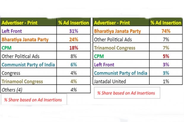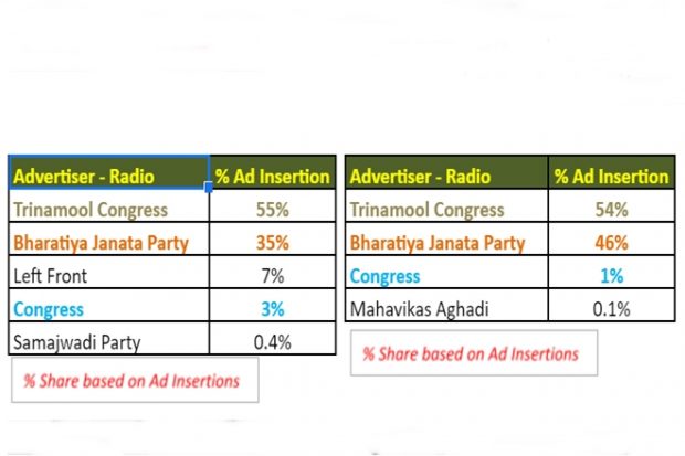 However, TMC topped the charts with radio advertisements as the political party accounted for 54% of the total ad insertions on radio. Interestingly, Trinmool Congress was the top most party in both the years on radio medium. Following TMC was BJP with 46% ad insertions.