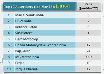 Furthermore, the top 10 advertisers contributed to 15% share of ad space in print with five advertisers in the top 10 list belonging to the auto sector. Maruti Suzuki topped the list of advertisers whereas SBS Biotech descended to 4th position during January-March 2023. SBS Biotech was ranked first in the same period last year while Maruti Suzuki was ranked third. The report also shed light on the addition of four new advertisers in the top 10 advertisers list in this period. Honda Motorcycle and Scooter, Bajaj Auto, MG Motor India and Torque Pharmaceuticals were the new entrants in the top 10 list of advertisers.