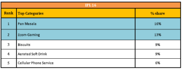The new categories that were added to the IPL-16 were biscuits, dry fruit, Ecom-travel and tourism, moisturising lotions/creams, and luggage. IPL-16 featured 19 new categories and 95 new brands during advertisements.