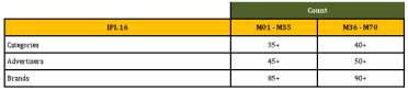 The categories grew to 40-plus in matches 36-70 from 35-plus in matches 1-35 whereas the number of advertisers grew to 50-plus as compared to 45-plus during the same period. Both categories witnessed an increase in numbers. While categories witnessed an increase of 5%, the number of advertisers grew by 8%.
