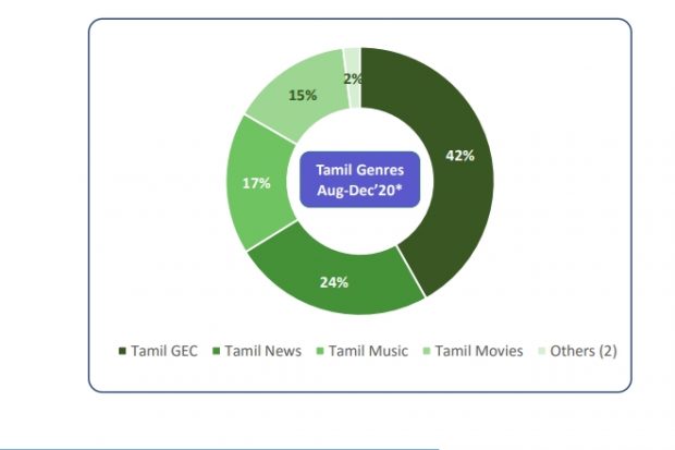Tamil channels registered a 12% rise in average ad volumes per day during Aug-Dec’20 when compared to Aug-Dec’19, with the month of December registering the highest rise. Out of this, Tamil GEC genre topped the advertising charts with 42% share of the pie, followed by Tamil news with 24% share. However, during Aug-Dec’20, Tamil News genre saw highest growth of 31% in ad volumes followed by Tamil Movies with 25% rise compared to Aug-Dec’19. On the back of the viewership growth, number of advertisers and brands also rose by 5% and 4% respectively during Aug-Dec’20* compared to Aug-Dec’19*.