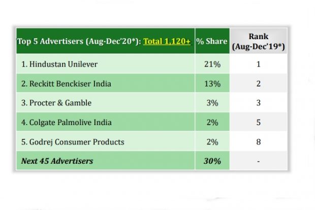 Hindustan Unilever remained the top spender with 20% share of ad volumes followed by Reckitt Benckiser with 18% ad volume share. Godrej Consumer Products claimed the third position with 5% share of ad volume. ITC and Colgate Palmolive India trailed behind at the fourth and fifth position with 3% and 2% share, respectively. Among the Top five advertisers, Godrej Consumer Products and Colgate Palmolive India observed positive rank shift. Top five advertisers held 50% share of ad volumes on Bengali channels. During Aug-Dec’20, Bengali channels witnessed over 300 new advertisers and more than 800 new brands advertising including Tuuple Technocraft, Lizol Cement Surface Cleaner, among others.