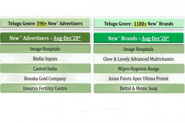 Hindustan Unilever emerged as the top spender with 19% ad volume share between Aug-Dec’20 followed by Reckitt Benckiser India with 7% share of ad volumes. Wipro and Procter & Gamble claimed the third and fourth position with 3% share, each. With 2% share of ad volume, Godrej Consumer Products stood at the fifth position. Top five advertisers held 34% share of ad volumes on Telugu channels. During Aug-Dec’20, Telugu movies genre witnessed over 590 new advertisers and more than 1,180 new brands onboarding the genre including Image Hospitals, Biofac Inputs, Castrol India, among others.
