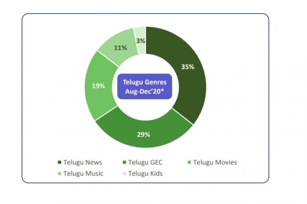 Average ad volumes on Telugu channels grew by 3% in Aug-Dec’20 when compared to Aug-Dec’19, with October’20 recording the highest ad volume rise of 22%. Out of this,Telugu News emerged on top of the advertising charts with 35% share of Telugu genres’ ad volumes in Aug-Dec’20 displacing Telugu GEC compared to Aug-Dec’19. Interestingly, the top 5 Telugu channel genres added more than 95% share during Aug-Dec’19 and Aug-Dec’20.