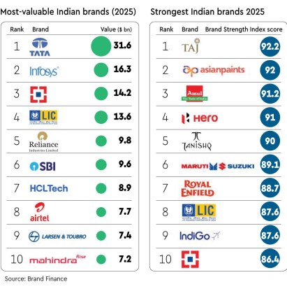 Tata Group held its spot as India’s most-valuable brand and became the first to top $30 billion in brand value (rising 10% to $31.6 billion), according to Brand Finance’s 2025 rankings released on Wednesday. The combined value of the country’s top 100 brands rose to $236.5 billion, the report added.