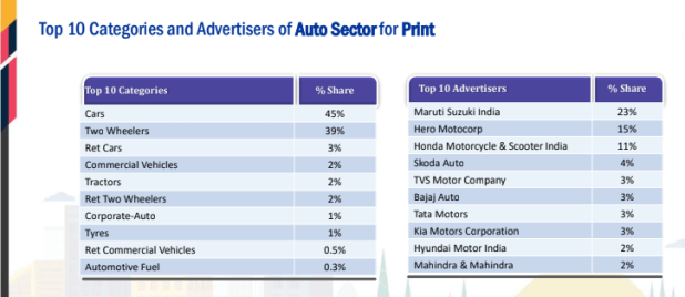 On comparing the categories, the report observed that the top 2 categories in print media from auto sector, cars and two wheelers together accounted for nearly 84% of the total ad space of the sector.