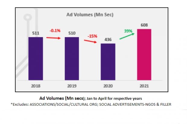 Despite the pandemic wrecking havoc across the country and many states declaring lockdown, advertising volumes on TV continue to scale new peaks. Total ad volumes rose by 39% during January to April 2021 as compared to the same period last year, according to the data provided by TV audience measurement body, Broadcast Audience Research Council (BARC). Interestingly, this growth is the highest when compared to the same period in the previous years.