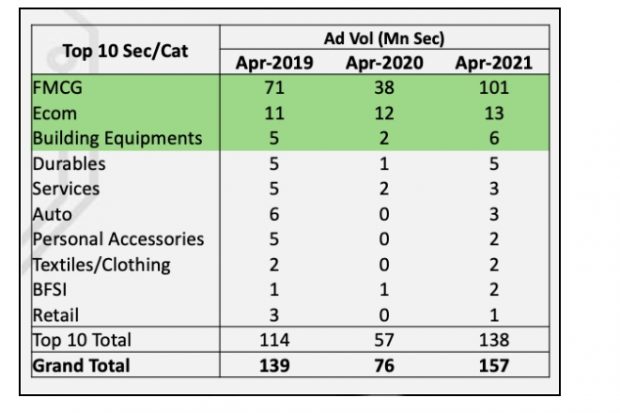 Ad volumes for the Top three sectors such as FMCG, e-commerce and building equipment have witnessed an increase in April 2021 as compared to 2019 and 2020. Meanwhile, ad volumes for durables are stable at 2019 levels. FMCG in April 2021 grew by 166% compared to 2020. Digital-native brands continue to contribute significantly towards the growth of TV ad volumes, particularly those from the e-commerce category. As a positive sentiment in the construction sector, ad volumes for the ‘Building Equipments’ category posted a steep 200% growth in April 2021 over April 2020.