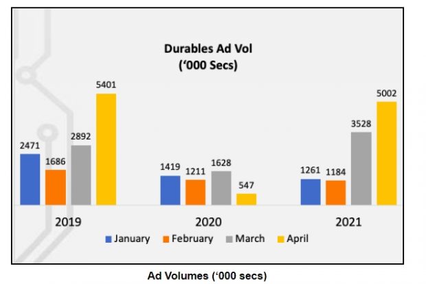 As for Durables, ad volumes of the sector increased 4x for March and April 2021 combined from 2020 and are 3% higher than 2019. 39 new advertisers in the Durables Sector advertised in April 2021, that were not active in the last two years during the same period. Moreover, there were 58 new brands that began advertising in April 2021.