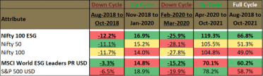 The relatively lesser drawdown is more pronounced in the global markets and, of late, seen in India too. However, during upcycles, the domestic ESG theme has relatively done better.