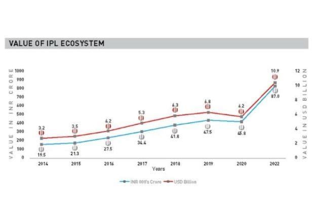 The value of the Indian Premier League (IPL) Ecosystem registered a 75% growth since 2020 and now stands at $10.9 billion, stated the ‘Beyond 22 Yards’ report released by D and P Advisory. The IPL Ecosystem represents the value generated by the IPL as a business. As per the report, the IPL was valued at $6.2 billion in 2020 and this valuation makes it a Decacorn (a business with a value of more than $10.0 billion) within 15 years of inception.