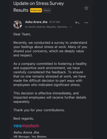 It all began with an alleged email shared by a copywriter from YesMadam, revealing that the company conducted a survey on workplace stress. According to the post, nearly 50% of employees reported feeling stressed, prompting the company to fire those very employees—a response that triggered outrage across social media.