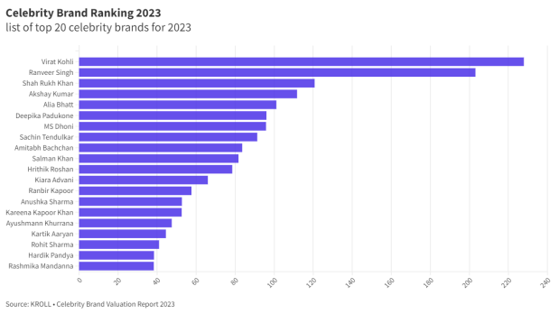 To be sure, 2023 has seen its fair of changes in the valuation game. For instance, this year saw the return of Shah Rukh Khan or King Khan as he is popularly known to the third spot with a valuation of $120.7 millon. Khan perhaps is classic example of how the matrix works. The actor who had slipped to the 10th position, last year returned with a bang. According to the report, much of the credit goes to the box office collection of films Jawan and Pathaan of more than $100 million, each. Industry stakeholders believe while Khan’s stardom has never dimished, due to the up and down faced on the box office, his valuation has suffered. “Brands have a preset thinking that is if a star is rising, they latch onto their popularity and as on when their success diminishes, they are the first to abandon the ship. Typically it’s brands that bask in the popularity of stars. In very few cases, brands have been successful in making celebrities out of models. For instance, when Pepsi chose actor Aishwarya Rai or Shahid Kapoor even before they became famous. Would any brand have taken Neeraj Chopra had he not proven his mettle in his field?Stars are always stars. They may need brands for extra money or to fill time between shoots, but not as much as brands need the stars for their popularity and immense follower base,” Soumitra Karnik, independent creative consultant said.
