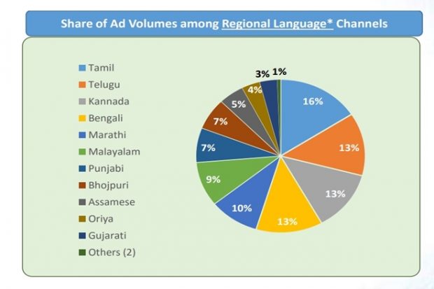 Regional language channels led the television advertising chart with 57% share of the overall television ad volumes, according to the data released by AdEx India, a division of TAM Media Research. Out of this, Tamil channels topped the charts with 16% share of the regional television ad volumes with Telugu, Kannada and Bengali following behind with 13% share of ad volumes, each. Meanwhile, average ad volumes per day rose 74% in June 2020 as opposed to April 2020, recording a two-fold rise in ad volumes.