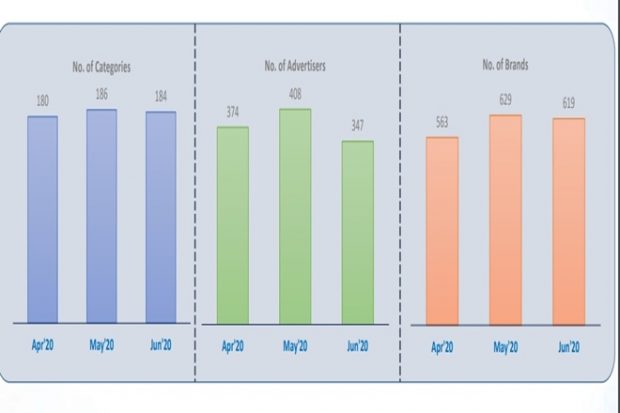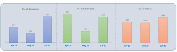 Tamil channels witnessed 82% growth in average ad volumes per day in week 26 (June 21-27, 2020) when compared to week 15 (April 5-10, 2020). Interestingly, while the number of categories and brands remained stable during May- June, advertisers registered 14% decline with the tally dipping to 347 advertisers in June 2020 as opposed to 409 advertisers in May 2020.