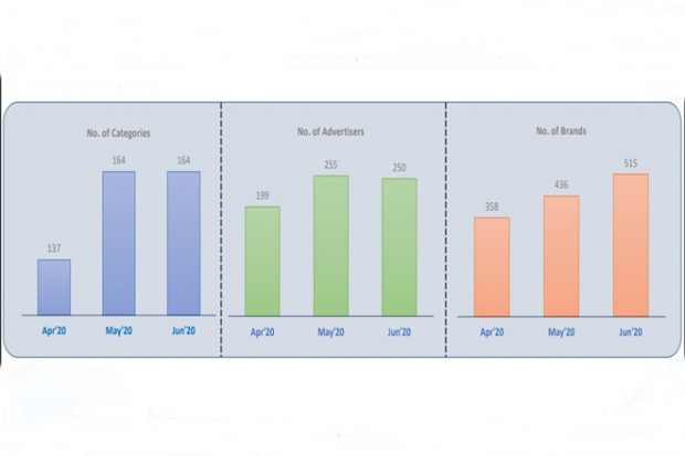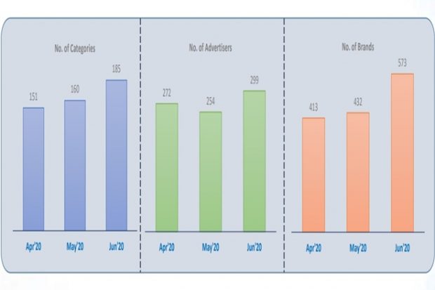 Bengali channels witnessed 48% growth in average ad volumes per day in week 26 (June 21-27, 2020) when compared to week 15 (April 5-10, 2020). Week 26 registered twofold rise in ad volumes compared to week 15. Interestingly, the number of categories, advertisers and brands peaked in June when compared to April 2020. Tally of categories grew by 17% in June 2020 when compared to May 2020. Meanwhile, the tally of advertisers and brands recorded 9% and 26% increase, respectively, in June 2020, when compared to May 2020.