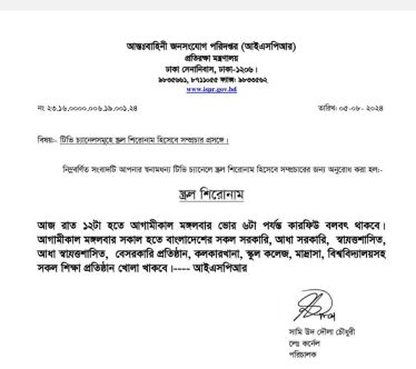 A curfew will be enforced in Bangladesh from midnight to 6 a.m. All government, semi-government, academic institutions, and industries will resume operations starting Tuesday, according to the ISPR, Bangladesh.
