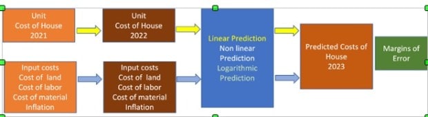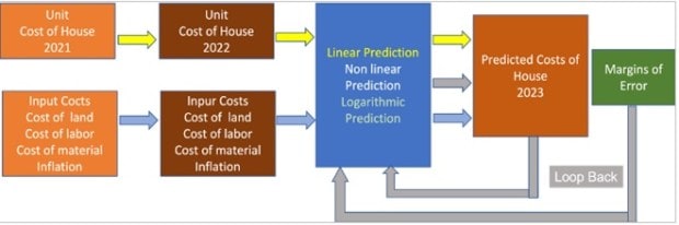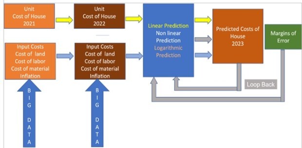 The cost of a house could be either the unit cost when bought as a whole or the sum of input costs which go into making the house. For this example, consider that these input costs are limited to land, labour, material and inflation only. In Stage 1, these costs for 2021 and 2022 could be fed individually or in an integrated form to an AI platform/machine and run though programs based on mathematical algorithms. These could be linear, non-linear or logarithmic predictive models. The output would be the predicted costs of a house in 2023 within a upper and lower limit in a band. The output would also contain a margin of error.