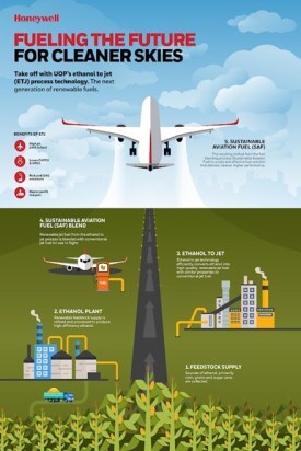 Honeywell’s ethanol-to-jet fuel (ETJ) processing technology utilizes innovative, high-performance catalysts and heat management capabilities to maximize production efficiency, resulting in a cost-effective, lower carbon intensity aviation fuel. Depending on the type of ethanol feedstock used, jet fuel produced from Honeywell’s Ethanol-to-Jet (ETJ) technology can reduce greenhouse gas (GHG) emissions by 80 percent on a total lifecycle basis, compared to petroleum-based jet fuel