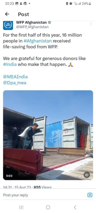This contribution from India has garnered recognition from pivotal stakeholders in Afghanistan, with the UNWFP expressing gratitude.