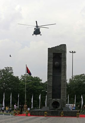 Delhi: Chopper of the Indian Air Force showers flower petals on the Police War Memorial in order to express gratitude and appreciation towards the police officials#COVID19 pic.twitter.com/HTr0K7zt2h
