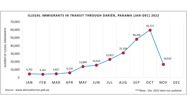 The total number of illegal immigrants in transit though Darien is 227987, an illustrated graph shows the per month transit recorded in (Jan-Dec) 2022.