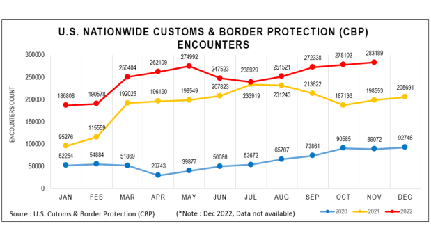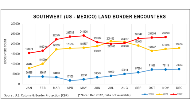 On the other side, Southwest (US – MEXICO) Land Border Encounters in Year 2022 (Jan-Nov) is 2.32 million is as follow, Year 2021 (Jan-Dec) is 2.035 million and Year 2020 (Jan-Dec) is 0. 54 million.