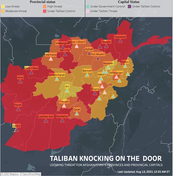 The UN envoy to Afghanistan, Deborah Lyons, warned on 06 August 2021 (Friday) that Afghanistan risks “descending into a situation of catastrophe so serious that it would have few, if any, parallels this century”…..and that was just scant hours before the first Afghan provincial capital, Zaranj, provincial capital of Nimroz Province, fell to the Taliban. As I write, the summation of the ground situation in Afghanistan in terms of territorial control is an entire nation disintegrating into a rapidly shrinking archipelago of government-held areas centering around Kabul. Today, a bare week after the fall of the first provincial capital, a total of 14(total of 34 all-Afghanistan) provincial capitals – four in southern Afghanistan, one in central Afghanistan, two in West Afghanistan and seven in northern Afghanistan – are under Taliban control. The map below affords a visual of the situation as of today: –