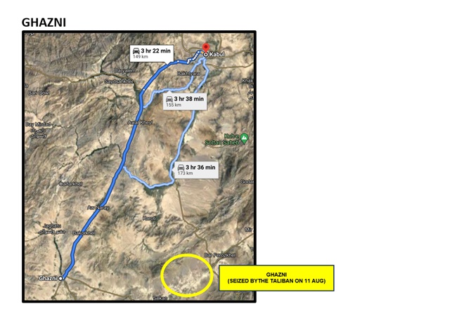 See map above. Capital of Ghazni Province. This city has been under persistent threat since 2014 and partially overrun in 2018. It lies on the MSR connecting Kabul to Kandahar. It provides a staging area for the Taliban to assemble their forces before the final push through Wardak Province to the North and onto the gates of Kabul.