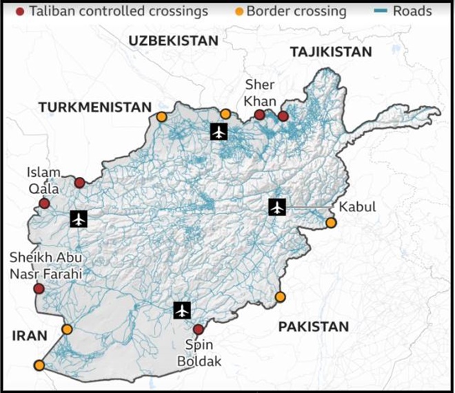 On 17 July 2021 as President Ashraf Ghani addressed a conference in Uzbekistan on regional connectivity, Afghanistan was being progressively disconnected from its neighbors by the seizure of seven key and strategic Border Crossings by the Taliban. Map below refers: –