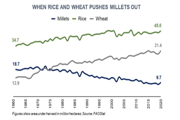 Two events in particular in post-independent India can be attributed to the disappearance of millets from the farmlands and food baskets in the country: the Green Revolution in the 1960s and the Public Distribution System.
