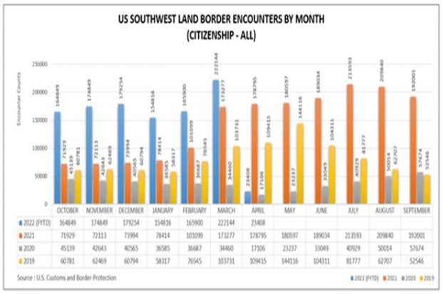 According to US Customs and Border Protection, the total number of undocumented migrants apprehend at Southwest Land border by US Border Patrol (USBP) and Office of Field Operations (OFO) in 2022 FYTD (Oct 2021 to Apr 2022) were 1295900 from all over the world, where in 2021 (Oct 2020 till Sep2021) were 1734686, 2020 (Oct 2019 till Sep2020) were 458088, 2019 (Oct 2018 till Sep 2019) were 977509. These numbers clearly shows the undocumented migrants are gradually rising every year.
