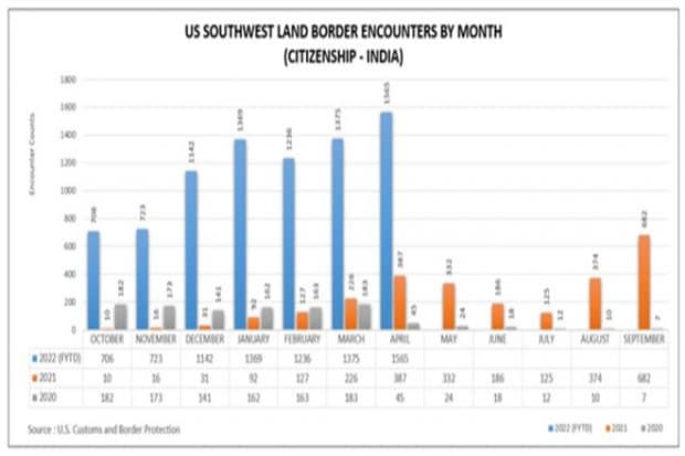 On the other hand, the total number of undocumented Indian migrants apprehended at Southwest Land border by US Border Patrol (USBP) and Office of Field Operations (OFO) in 2022 FYTD (Oct 2021 to Apr 2022) were 8119 Indian, in 2021 (Oct 2020 till Sep 2021) were 2588, 2020 (Oct 2019 till Sep 2020) were 1120.