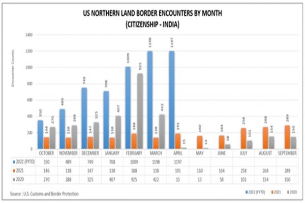 On the US Northern Land Border, the total number of undocumented Indian migrants apprehend at Northern Land Border by US Border Patrol (USBP) and Office of Field Operations (OFO) in 2022 FYTD (Oct 2021 to Apr 2022) were 5700 Indians, where in 2021 (Oct 2020 till Sep 2021) were 2225, 2020 (Oct 2019 till Sep 2020) were 3128.