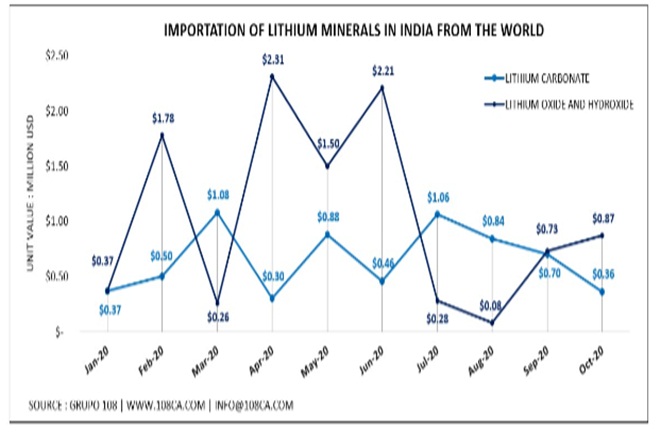 Lithium not only to used for manufacture of batteries but also used for manufacturing of special glass, Frits for ceramics and enamels, Cements and special adhesives, Powders for continuous casting, Industrial air conditioning,Aluminum and pharmaceuticals. India imports nearly USD6.54 million valued Lithium Carbonate and USD10.38 million valued Lithium Oxide and Hydroxide in 2020 (Jan-2020 to Oct 2020).