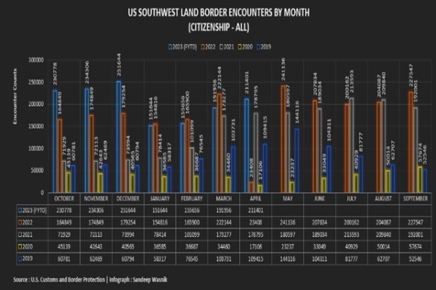 Undocumented immigrants most frequently enter the US through the Southwest border. Over 2,000 miles of land border separate the United States from Mexico, making it challenging for American border patrols to cover the entire distance. According to the US Southwest Border, 1647034 citizens from various nations were apprehended in 2022 (Jan – Dec), which is still regarded as the largest number. Prior to that, the years 2021 – 1516650 (Jan – Dec), 2020 – 329741 (Jan – Dec), and 2019 – 793465 (Jan – Dec).On the other hand, these recorded numbers are 71065 in 2023 (January to April). The Info-graph will give the exact figure for illegal migrants encountered at the US Southwest Land Border by month.