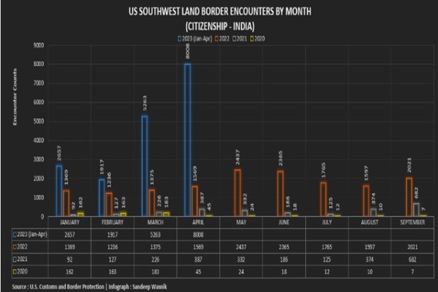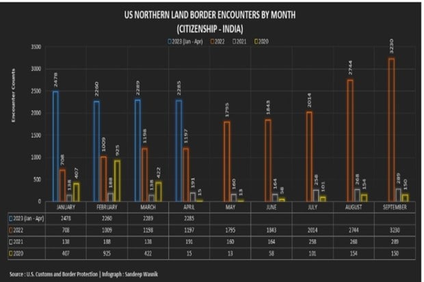 The world was shocked by the news, but it had no effect on the flow of illegal immigrants coming from India to the US. A family of four Indian nationals from the Gujarati village of Dingucha, Jagdish Patel, 39, his wife, Vaishali, 37, and their 2 children Vihangi, 12, and Dharmik, 3, were found frozen to death in January 19, 2022 not far from the US-Canada border. Infographics show the monthly numbers of Indian encounters at the US northern land border. Indians apprehended at Northern Border in 2023 are 9312, followed by 2022 (Jan – Dec) – 15738. 2021 (Jan – Dec) – 1794, 2020 (Jan – Dec) – 2245 as shown in info-graph.