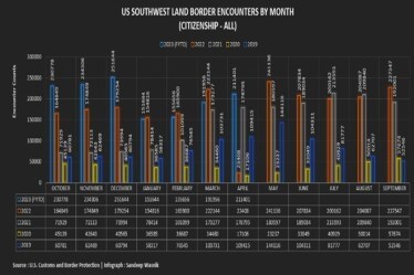 Undocumented immigrants most frequently enter the US through the Southwest border. Over 2,000 miles of land border separate the United States from Mexico, making it challenging for American border patrols to cover the entire distance. According to the US Southwest Border, 1647034 citizens from various nations were apprehended in 2022 (Jan – Dec), which is still regarded as the largest number. Prior to that, the years 2021 – 1516650 (Jan – Dec), 2020 – 329741 (Jan – Dec), and 2019 – 793465 (Jan – Dec).On the other hand, these recorded numbers are 71065 in 2023 (January to April). The Info-graph will give the exact figure for illegal migrants encountered at the US Southwest Land Border by month.