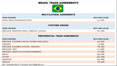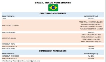 Brazil has been seeking to diversify its trading partners and minimize its reliance on traditional markets such as the United States and China. The country is also looking to expand its trade with other emerging economies. Today, Brazil has 17 trade agreements in force also country is a founding member of Mercosur, a customs union with Argentina, Uruguay, and Paraguay. Mercosur has free trade