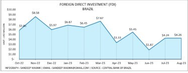 According to Banco Central do Brasil (Central Bank of Brazil), Brazil received a net inflow of US$4.26 billion in foreign direct investment (FDI) in August 2023, a 57.4 percent decrease from the previous year. FDI in Brazil from January to August 2023 totalled US$40.14 million, almost 38 percent less than US$59.2 billion during the same period the year before. Since the beginning of 2023, the 12-month FDI has been declining; in August, it was US$65.9 billion, down from US$71.7 billion in July. This is the lowest index in a year, representing 3.21 percent of Brazil’s GDP. Below info-graph shows the Brazil Foreign Direct