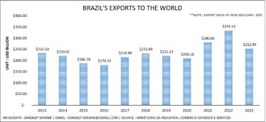 Brazil is a significant exporter of meat, corn, and soybeans among other agricultural products. Significant mineral exports from the nation include iron ore, copper, and gold. Furthermore, Brazil exports manufactured items, including machinery, cars, and airplanes. Brazil exports recorded in 2022 were US$334.14 billion (FOB); this shows a significant increase of 18.99 percent as compared to the previous year US$280.81 billion (FOB). The infographic shows the historic data of Brazilian exports to the world.
