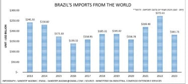 In 2022, Brazil importation recorded US$272.61 billion; this shows an increase of 24.25 percent in imports compared to the previous year record of US$219.40 billion. The infographic shows the historic data of Brazilian imports from the world.