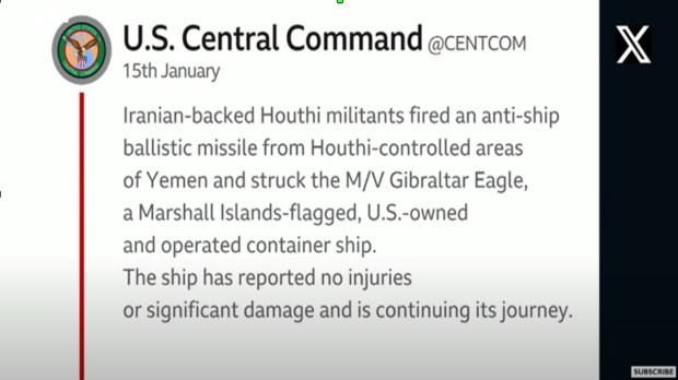 Houthis hit a US-owned ship. A day after the Houthis tried to hit a US Navy ship in the Red Sea, on 15 January they fired a missile fired which hit the Gibraltar Eagle, a bulk carrier owned by a U.S. company and flagged to the Marshall Islands, that had been sailing in the Gulf of Aden, south of Yemen.