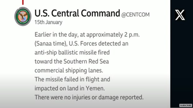 Attack on US Naval ship. The Houthis targeted a US naval destroyer with an anti-ship cruise missile. The US Central Command wrote on X: “On Jan. 14 at approximately 4:45 p.m. (Sanaa time), an anti-ship cruise missile was fired from Iranian-backed Houthi militant areas of Yemen toward USS Laboon (DDG 58), which was operating in the Southern Red Sea. The missile was shot down by U.S. fighter aircraft in the vicinity of the coast of Hudaydah, a port city in the west of Yemen whose international airport was targeted in joint US-UK airstrikes. There were no injuries or damage reported. The Yemeni rebel group has claimed responsibility for the attack.