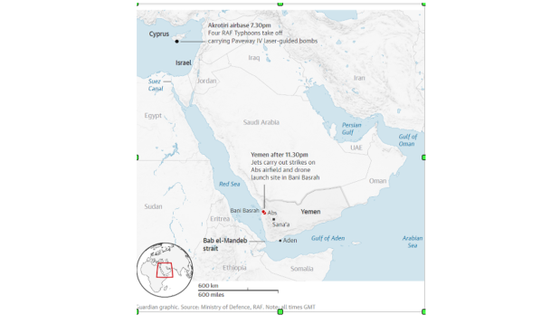 They used Paveway IV guided bombs to conduct precision strikes on two Houthi facilities, a site in Bani in north-western Yemen used by the Houthis to launch reconnaissance and attack drones and an airfield in Abbs used to launch cruise missiles and drones. Several buildings supposedly involved in drone operations were targeted by the aircraft.
