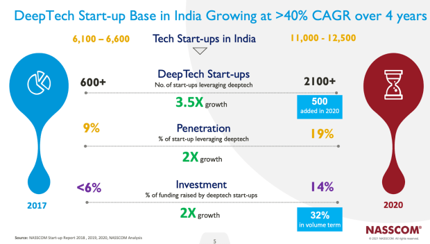 According to NASSCOM, deep-tech start-ups in India raised USD 2.7 billion in venture funding in 2021, in which Bengaluru accounts for 25-30% of India’s deep-tech start-ups, followed by Delhi-NCR (15-20%) and Mumbai (10-12%). Phenomenal interest in generative AI after the release of ChatGPT and other chatbots based on large language models (LLMs) – have led to significant interest by investors in deep tech.