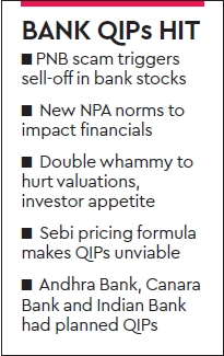 Banks looking to raise funds from the equity market to shore up their capital bases are suddenly facing the prospect of a delay in their fundraising plans. Three banks — Andhra Bank, Indian Bank and Canara Bank — that were planning to float their qualified institutional placement (QIP) issues in the near future are likely to be the most affected by the imposition of new provisioning norms for non-performing assets (NPA) by the Reserve Bank of India, and the outbreak of the Punjab National Bank bank guarantee scam of over Rs 11,300 crore. The two developments have muddied the waters for prospective issuers and cast a shadow on their prospective earnings and intrinsic value. A source in the know of the development said it does not make business sense to come out with a QIP when the stocks of these companies are getting battered. “QIP has a floor price formula by Sebi (Securities and Exchange Board of India).