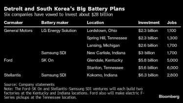 LG Energy Solution Ltd., SK On Co. and Samsung SDI Co. have planned about $28 billion of investment along with General Motors Co., Ford Motor Co. and Stellantis in US electric-vehicle battery factories they’ll run as joint ventures. Those plants are major sticking points in contract negotiations between the three automakers and the United Auto Workers, which wants to unionize the 19,600 people the companies plan to hire.
