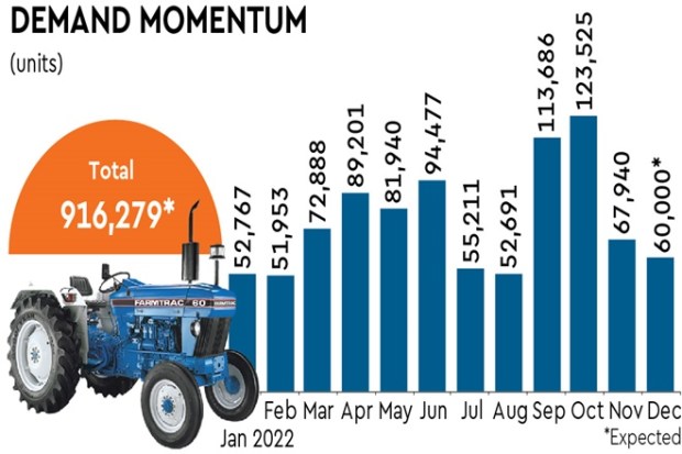 Domestic tractor volumes for the year is expected to close at more than 9.10 lakh, beating last year total of 9.03 lakh, which was the best-ever year for the industry and the second consecutive year of growth since the decline of 2019.